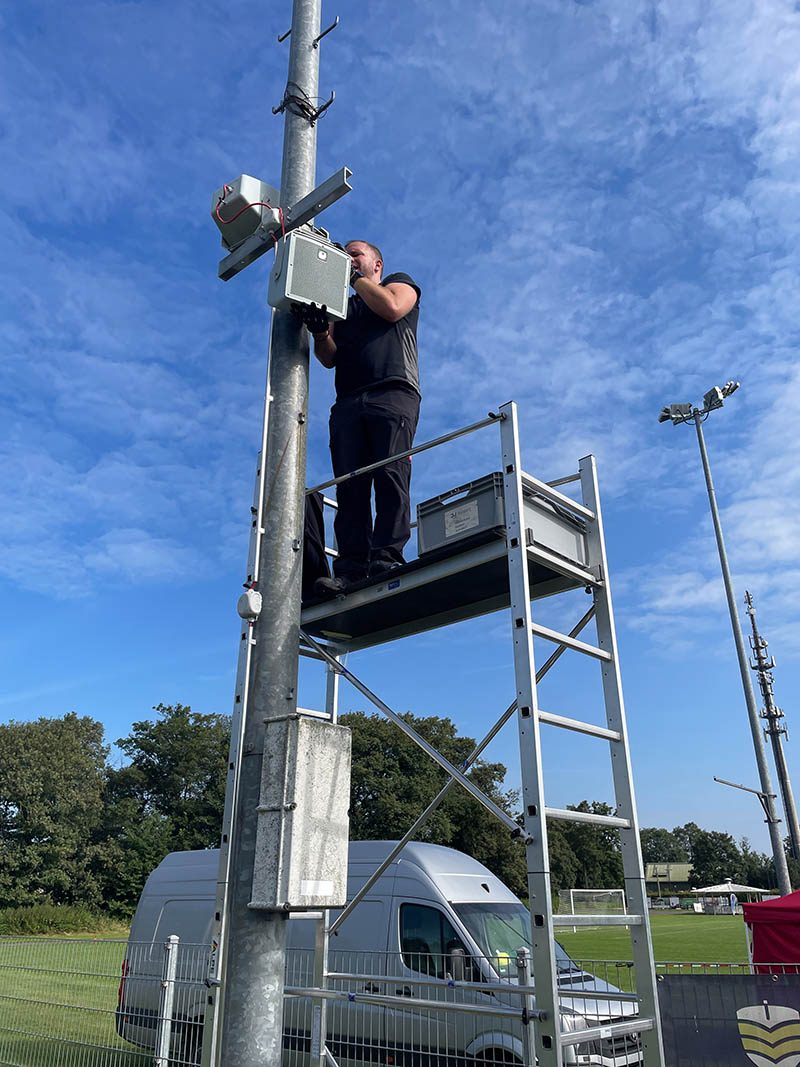 Techniker befestigt Lautsprecher fachgerecht an einem Mast auf einem Sportplatz